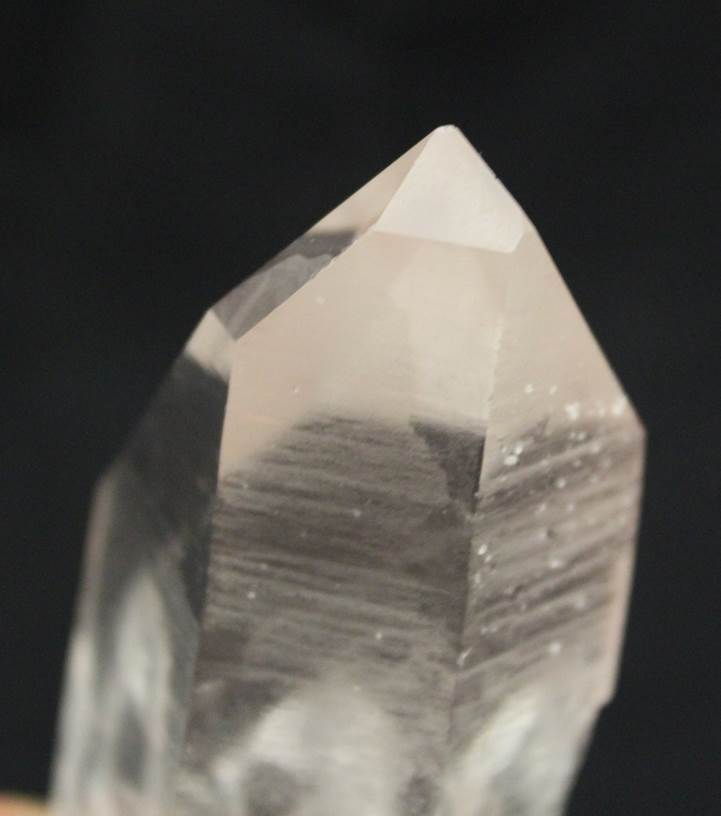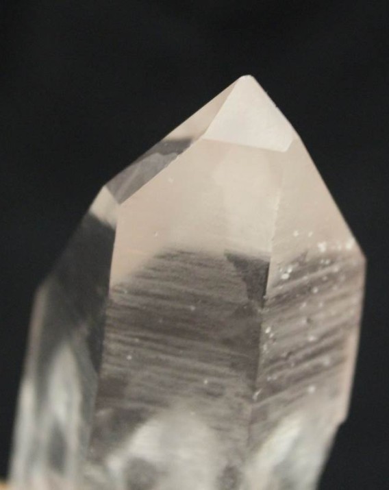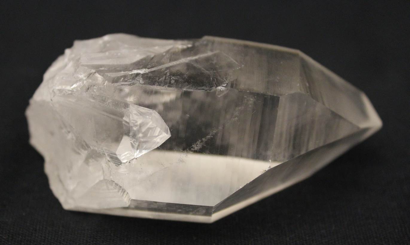 MINERALOGY, PROPERTIES, OCCURRENCE: Rock crystal is the transparent, colorless variety of macrocrystalline quartz [silicon dioxide, SiO2).  The word “quartz” is believed to have originated with the Slavic kwardy, meaning “hard,” in allusion to its substantial hardness.  It crystallizes in the hexagonal system and occurs mainly in hydrothermal veins, granite pegmatites, and as geode linings as short-to-long, horizontally striated, hexagonal, prismatic crystals with pyramidal terminations and distinctive, water-clear transparency.  It has a Mohs hardness of 7.0, a conchoidal fracture, vitreous luster, and specific gravity of 2.65.