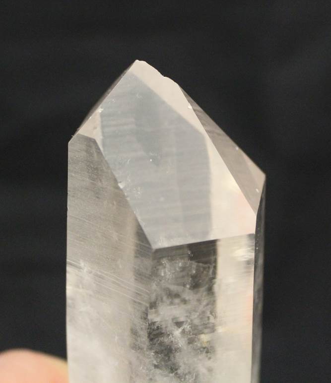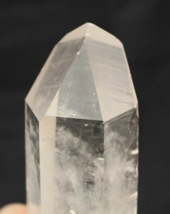 MINERALOGY, PROPERTIES, OCCURRENCE: Rock crystal is the transparent, colorless variety of macrocrystalline quartz [silicon dioxide, SiO2).  The word “quartz” is believed to have originated with the Slavic kwardy, meaning “hard,” in allusion to its substantial hardness.  It crystallizes in the hexagonal system and occurs mainly in hydrothermal veins, granite pegmatites, and as geode linings as short-to-long, horizontally striated, hexagonal, prismatic crystals with pyramidal terminations and distinctive, water-clear transparency.  It has a Mohs hardness of 7.0, a conchoidal fracture, vitreous luster, and specific gravity of 2.65.